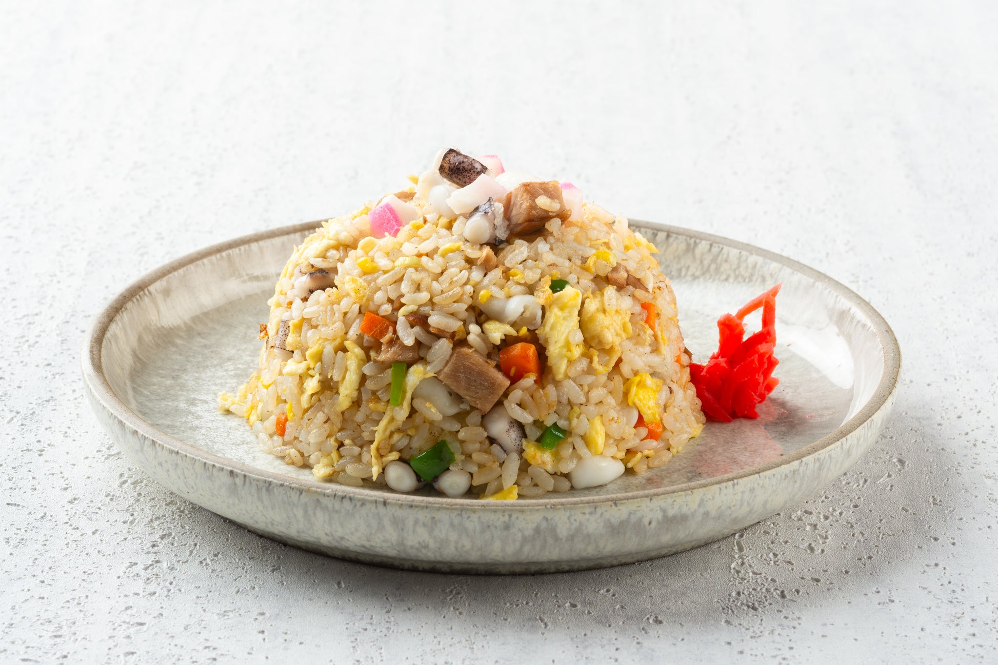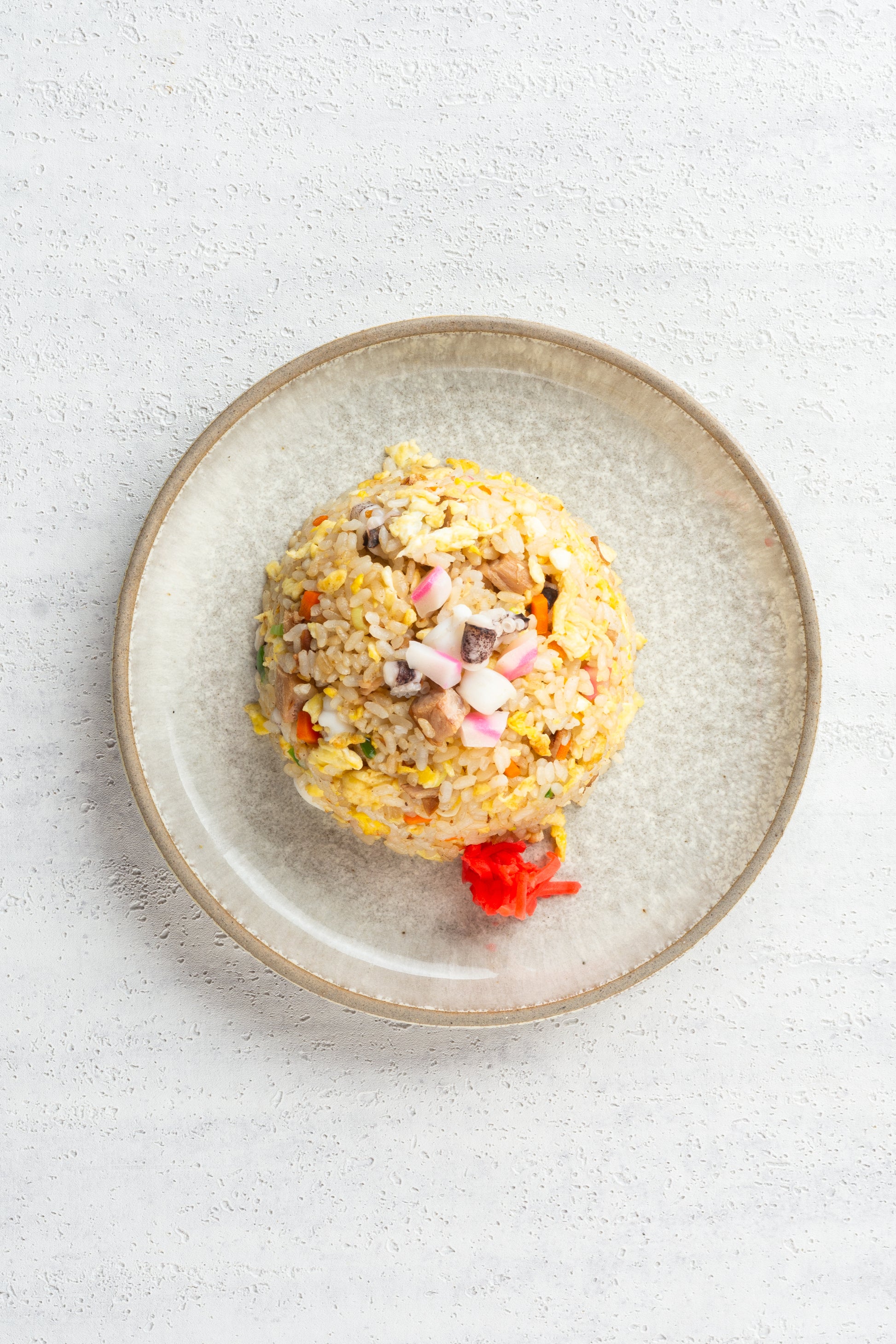 Japanese style fried rice with Squid, Egg, Chashu bits, leeks and Naruto
