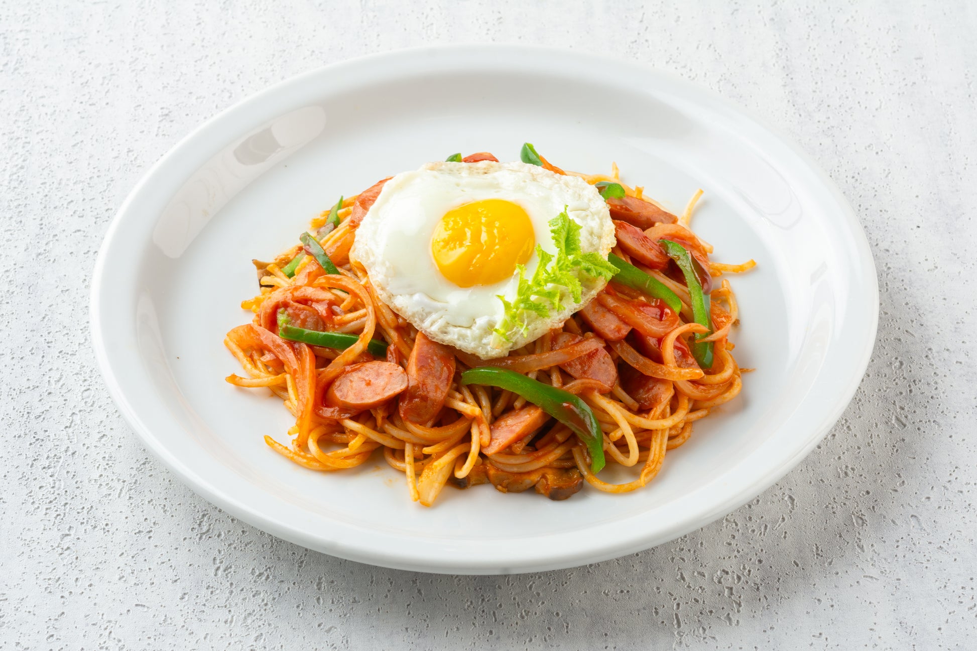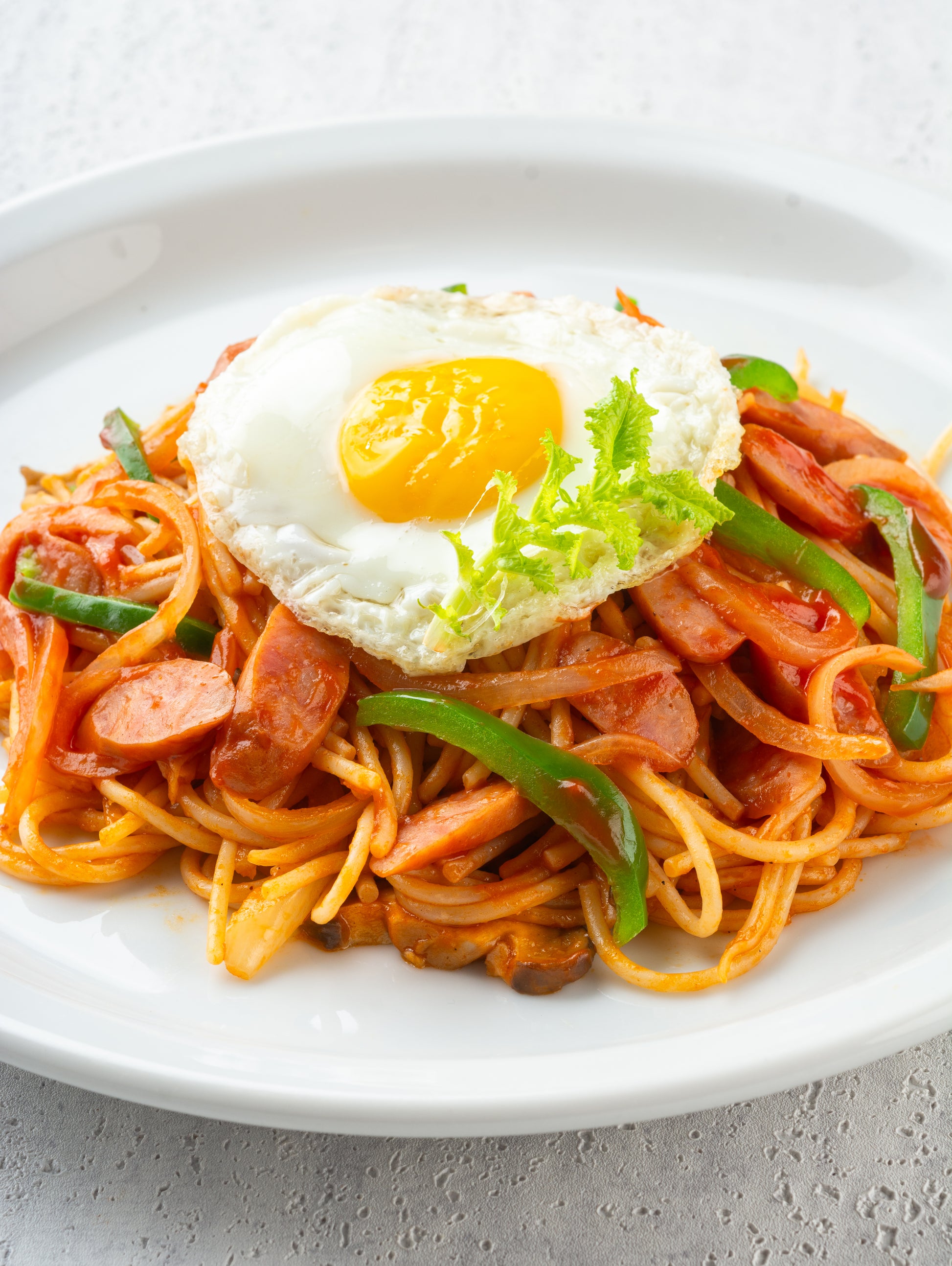 Popular Japanese itameshi pasta dishes consits of soft-cooked spaghetti, JAPANESE TOMATO KETCHUP , Japanese sausage, etc.,